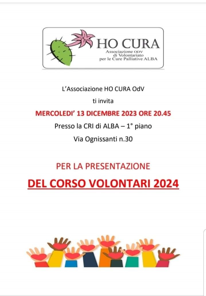 Mercoledì 13 Gennaio alle ore 20.45, presso i locali della CRI di Alba, in via Ognissanti,30 presenteremo il settimo corso di formazione volontari Ho Cura per l'anno 2024